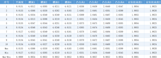 *Data description: 10 static measurements show the flatness repeatability is 0.0008mm, the groove depth repeatability is 0.0054mm, the boss height repeatability is 0.0057mm, and the locating post height repeatability is 0.0003mm.