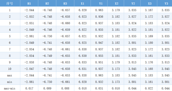 *10 sets of static data were measured, with a maximum Z-direction displacement of 0.009mm and a maximum XY-direction displacement of 0.019mm